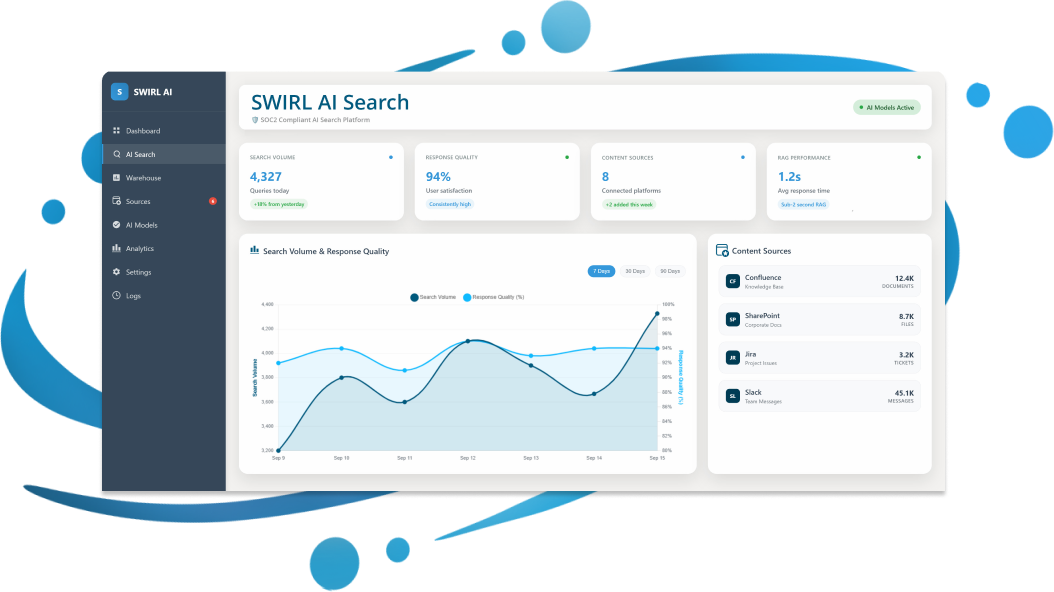 SWIRL AI Search unifies your organization’s internal and external data—without data migration, indexing, or duplication. Deploy in minutes and empower your teams with secure, real-time access to critical knowledge, all while preserving your existing security and compliance controls.